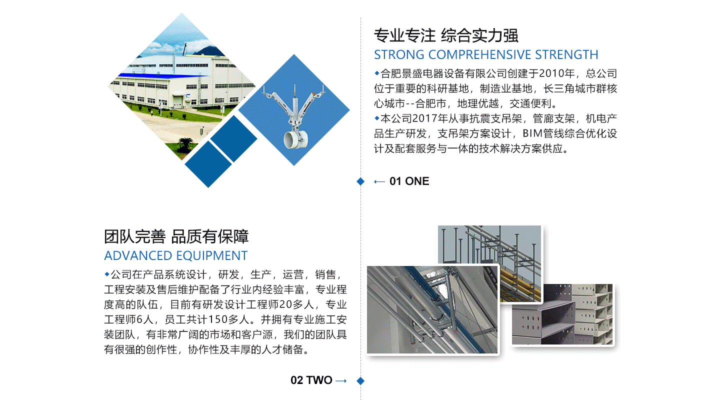合肥景盛電器設備有限公司創(chuàng)建于2011年,注冊資本3000萬,總公司位于中國重要的科研基地,制造業(yè)基地,長三角城市群中心城市-----合肥市,地理位置好,交通方便。本公司2017年從事抗震支吊架,電纜橋架,機電產品生產研發(fā),支吊架方案設計,BIM管線綜合優(yōu)化設計及配套服務與一體的技術解決方案供應。公司在產品系統(tǒng)設計,研發(fā),生產,運營,銷售,工程安裝及售后維護配備了行業(yè)內經驗豐富,服務程度高的隊伍,目前有研發(fā)設計工程師20多人,工程師6人,員工共計150多人。并擁有施工安裝團隊,有非常廣闊的市場和客戶源,我們的團隊具有很強的創(chuàng)作性,協(xié)作性及豐厚的人才儲備。 公司先后通過ISO9001:2015質量管理體系認證...